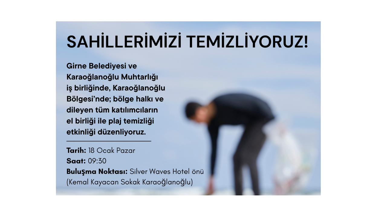 Girne Belediyesi ve Karaoğlanoğlu Muhtarlığı iş birliğinde, çevre duyarlılığını artırmak ve sahilleri temiz tutmak amacıyla Pazar günü plaj temizliği etkinliği düzenleniyor.