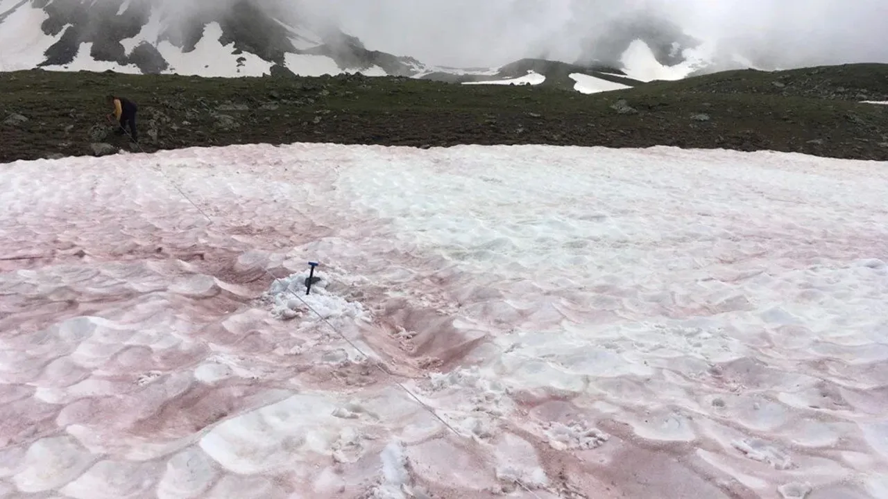 Bilim insanları, deniz seviyesinden 2 bin 500 metre yükselikte görünen kırmızı kardan örnekler topladı.