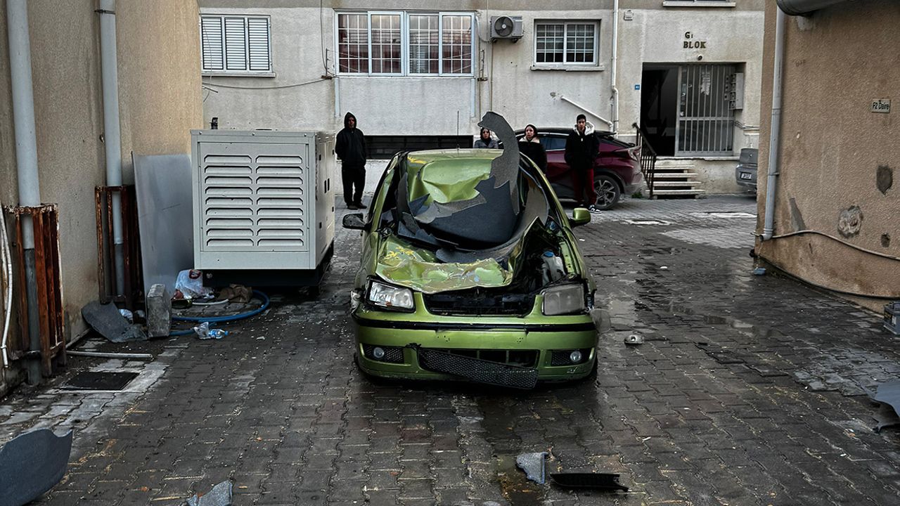 Ortaköy'de Gazeteci Hasan Tahsin Caddesi'nde apartmanın damındaki 1.5 tonluk plastik su deposu şiddetli rüzgarın etkisiyle apartmanın park yerindeki aracın üzerine düştü.