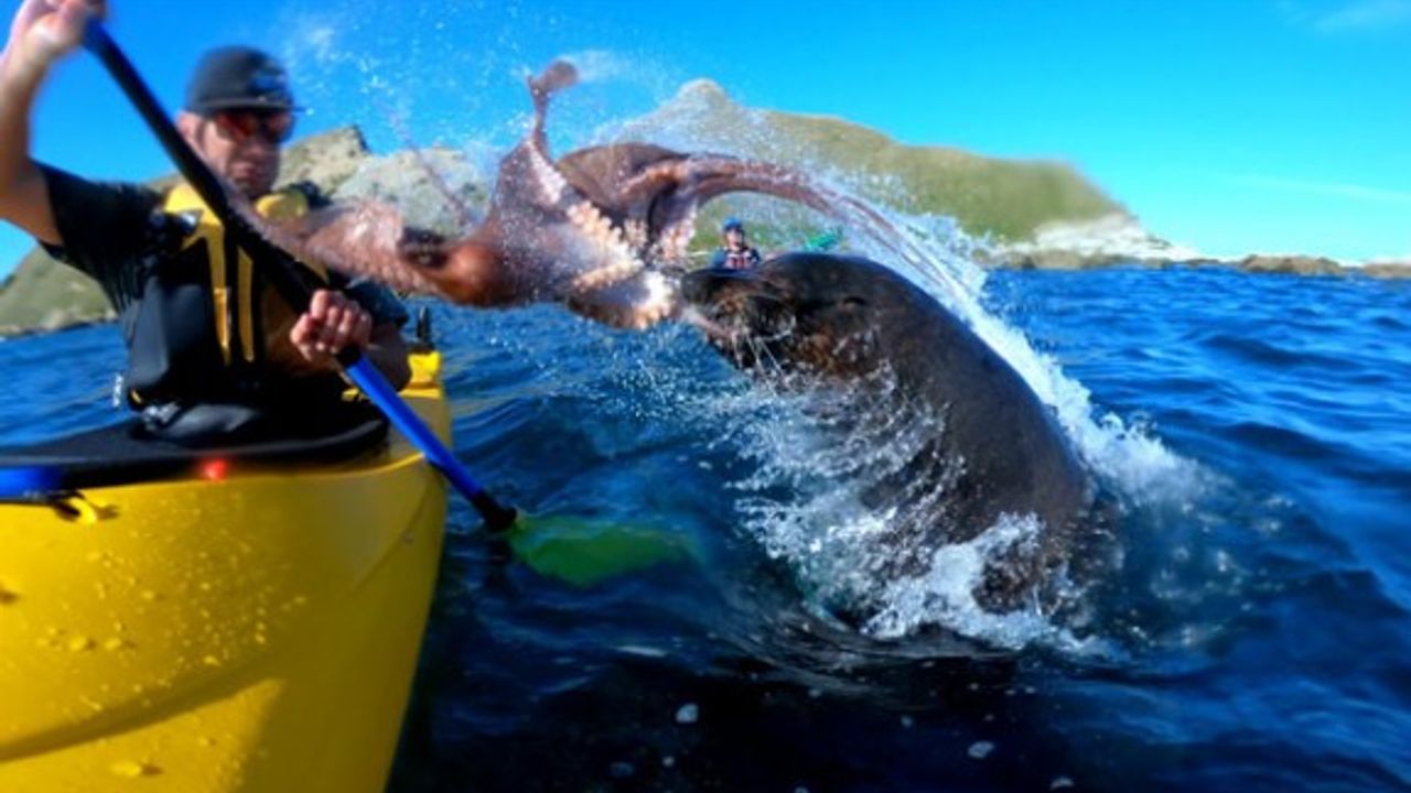 Yeni Zelanda'nın Kaikuro kasabası açıklarında bir fok balığı, kano kullanan bir erkeğin yüzüne ahtapot fırlattı.