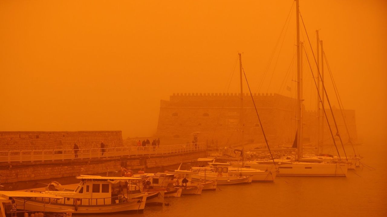 Yunanistan genelindeki kötü hava koşulları devam ederken, Girit Adası'nda gökyüzü Afrika'dan gelen çöl tozu nedeniyle kırmızıya büründü.