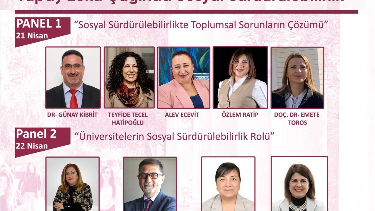 21 Nisan’da yapılacak ilk panelde “Sosyal Sürdürülebilirlikte Toplumsal Sorunların Çözümü” için KKTC Cumhurbaşkanlığı Engelleri Aşan Birim Başkanı Dr. Günay Kibrit, KKTC Başbakanlık Uyuşturucu ile Mücadele Komisyonu Başkanı Teyfide Tecel Hatipoğlu, Sosyal Hizmetler Dairesi Müdürü Alev Ecevit, Kıbrıs Türk Girişimci Kadınlar Derneği Akademik Koordinatörü Özlem Ratip, Girne Üniversitesi 60+ Tazelenme Üniversitesi Başkanı Doç. Dr. Emete Toros yer alacak. 22 Nisan ikinci günde ise, “Üniversitelerin Sosyal Sürdürülebilirlik Rolü” için düzenlenecek panelde UKÜ’den Prof. Dr. Fatoş Silman, YDÜ’den Prof. Dr. Murat Özgören, GAÜ’den Prof. Dr. Terin Adalı ve DAÜ’den Doç. Dr. Eda Yazgın yer alacak.