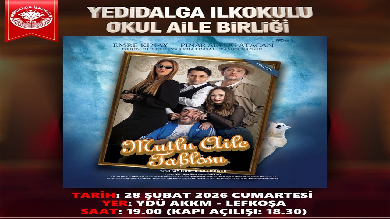 KKTC’nin güzide okullarından Yedidalga İlkokulu’nun Okul-Aile Birliği yıl boyunca düzenlediği kültürel, sosyal ve eğitim aktivitelerine bir yenisini daha ekledi. Yedidalga İlkokulu Okul-Aile Birliği tarafından organize edilen ve başrollerini tiyatro severlerin yakından tanıdığı ünlü oyuncular Emre Kınay, Pınar Altuğ Atacan, Derin Bülbül, Yarkın Ünsal ve Taner Ergör’ün paylaştığı Mutlu Aile Tablosu adlı oyun 28 Şubat tarihinde saat 19:00’da YDÜ AKM’de sergilenecek. Çağdaş Türk tiyatro sanatının ünlü sanatçılarının tiyatro severleri kahkaha tufanına boğacağı oyunun biletleri kibrisbiletcim.com veya okul idaresinden temin edilebilir.