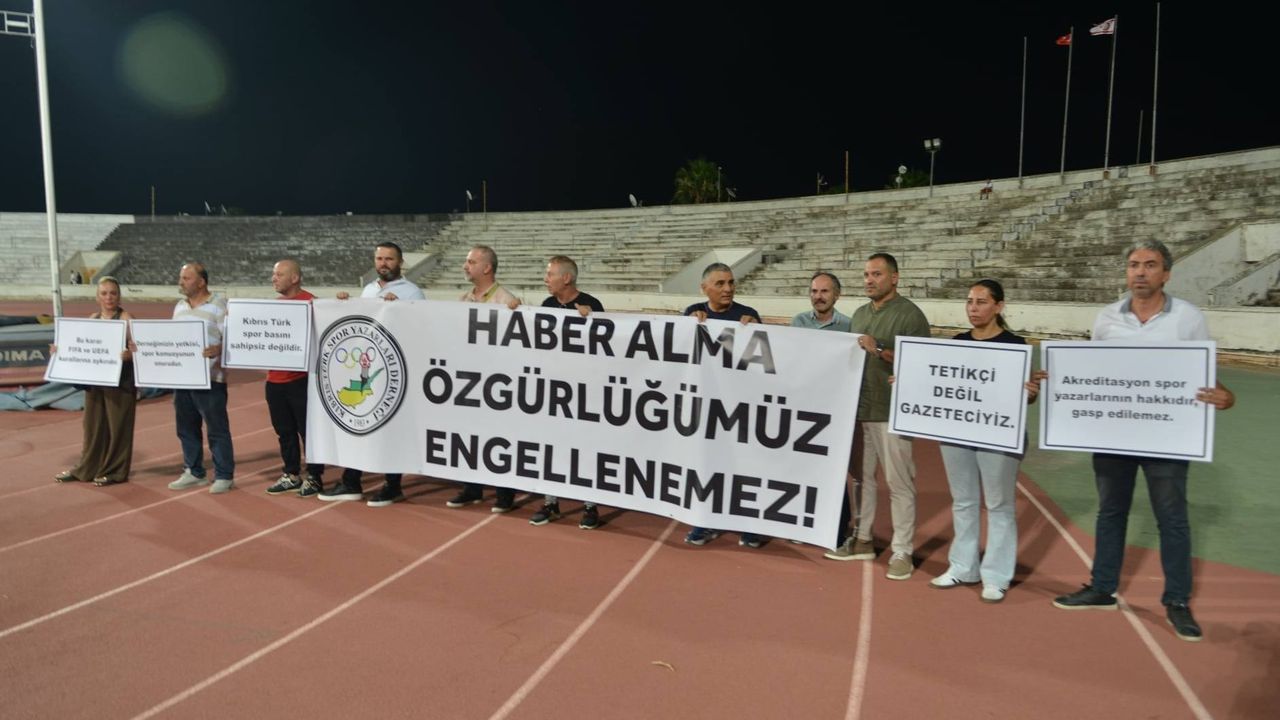“KTFF Başkanı Hasan Sertoğlu’nun, KTSYD Başkanı Necati Özsoy ve 10 yönetim kurulu üyesine, yeni sezonda maçlara akreditasyon yasağı koyduğu” gerekçesiyle yapılan eyleme, Basın-Sen de destek verdi.