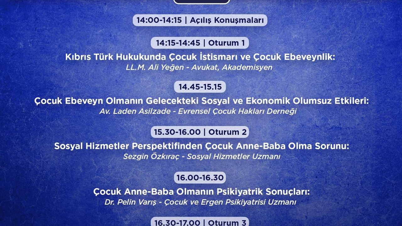 Panelin ilk oturumunda, “Kıbrıs Türk Hukukunda Çocuk İstismarı ve Çocuk Ebeveynlik” ile “Çocuk Ebeveyn Olmanın Gelecekteki Sosyal ve Ekonomik Olumsuz Etkileri” tartışılacak.