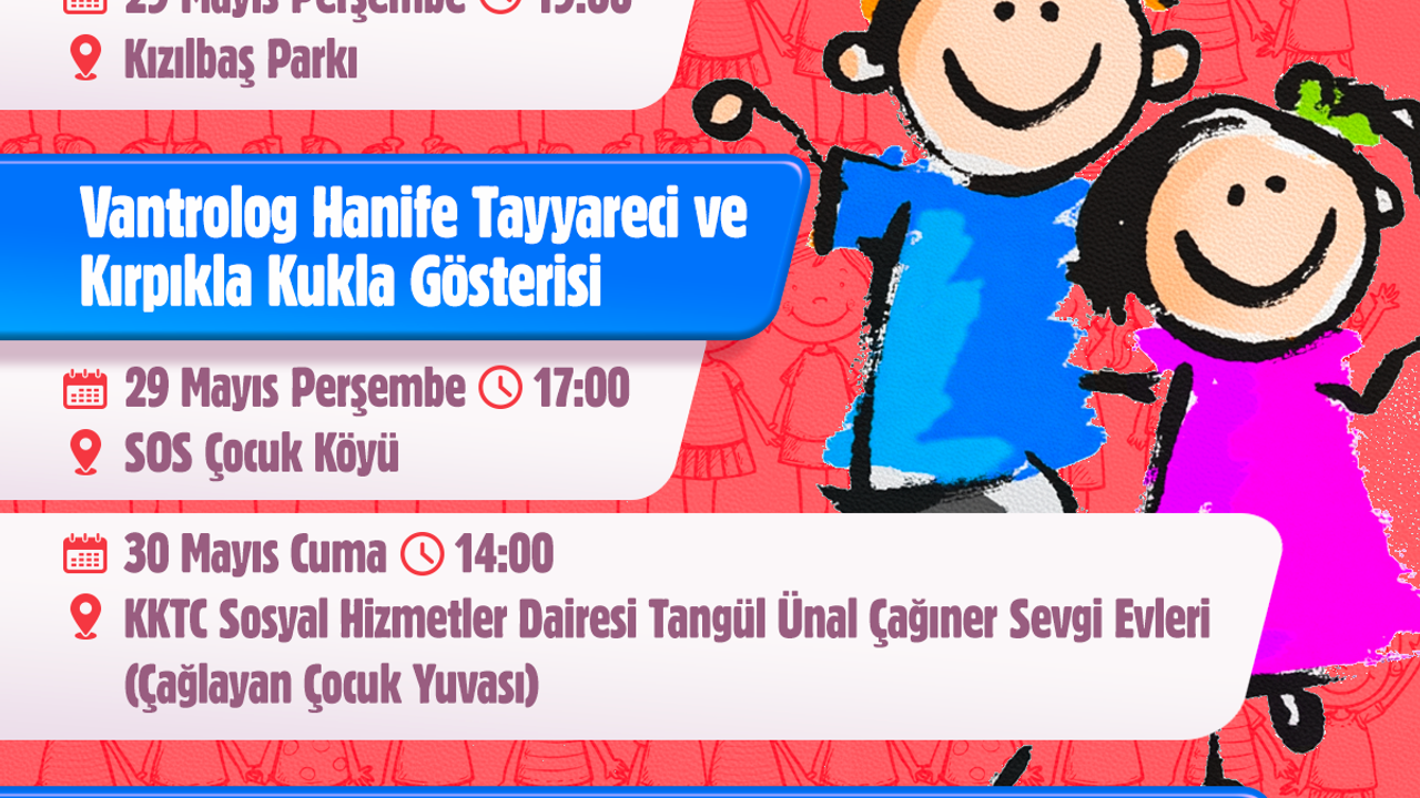 LTB organizasyonu ile vantrolog Hanife Tayyareci, KKTC Sosyal Hizmetler Dairesi Tangül Ünal Çağıner Sevgi Evleri (Çağlayan Çocuk Yuvası) çocuklarına yönelik bir Kukla Gösterisi yapacak. Gösteri, 30 Mayıs Cuma günü saat 15.00’de yapılacak.