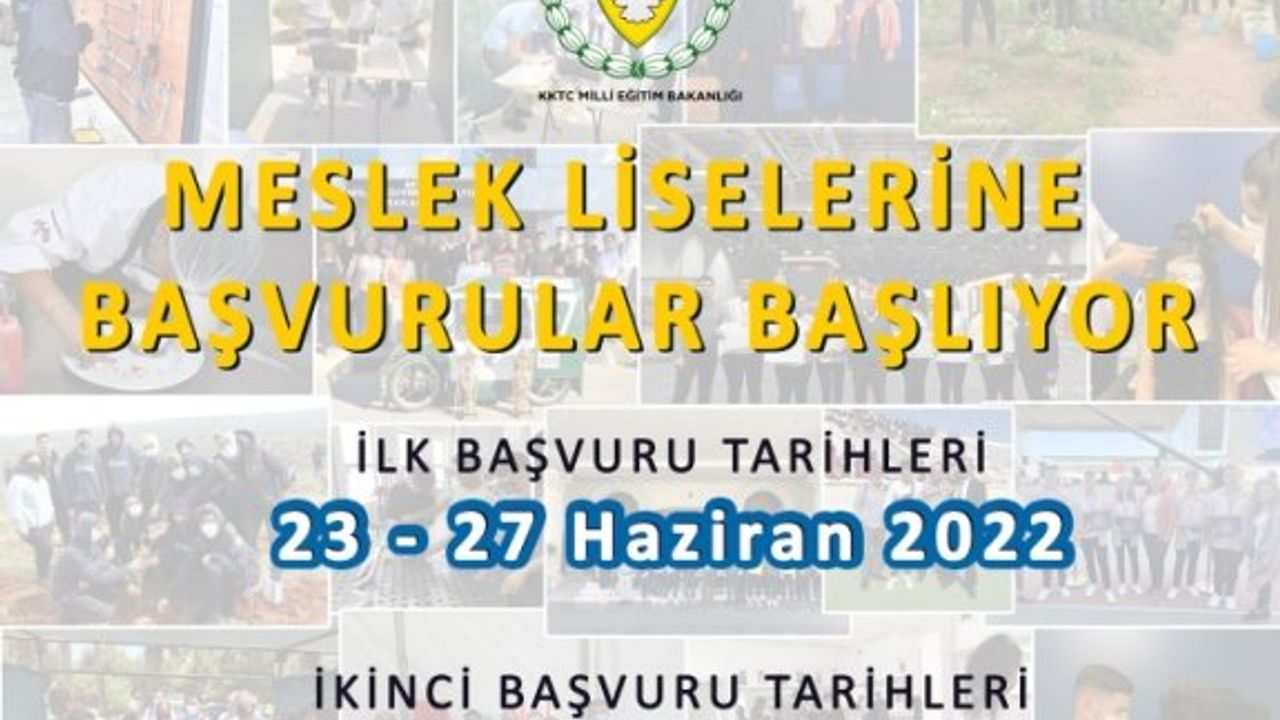 Milli Eğitim Bakanlığı Basın Bürosu'ndan yapılan açıklamaya göre, 2022-2023 Eğitim Öğretim Yılı için meslek liselerinin 9. sınıflarına başvuracak öğrenciler, başvurularını 23 - 27 Haziran (her iki tarih dahil) tarihlerinde mezun oldukları okullarda yapacak. Özel okullardan mezun olup mesleki eğitim almak isteyen öğrenciler ise başvurularını herhangi bir meslek lisesinde yapabilecek.