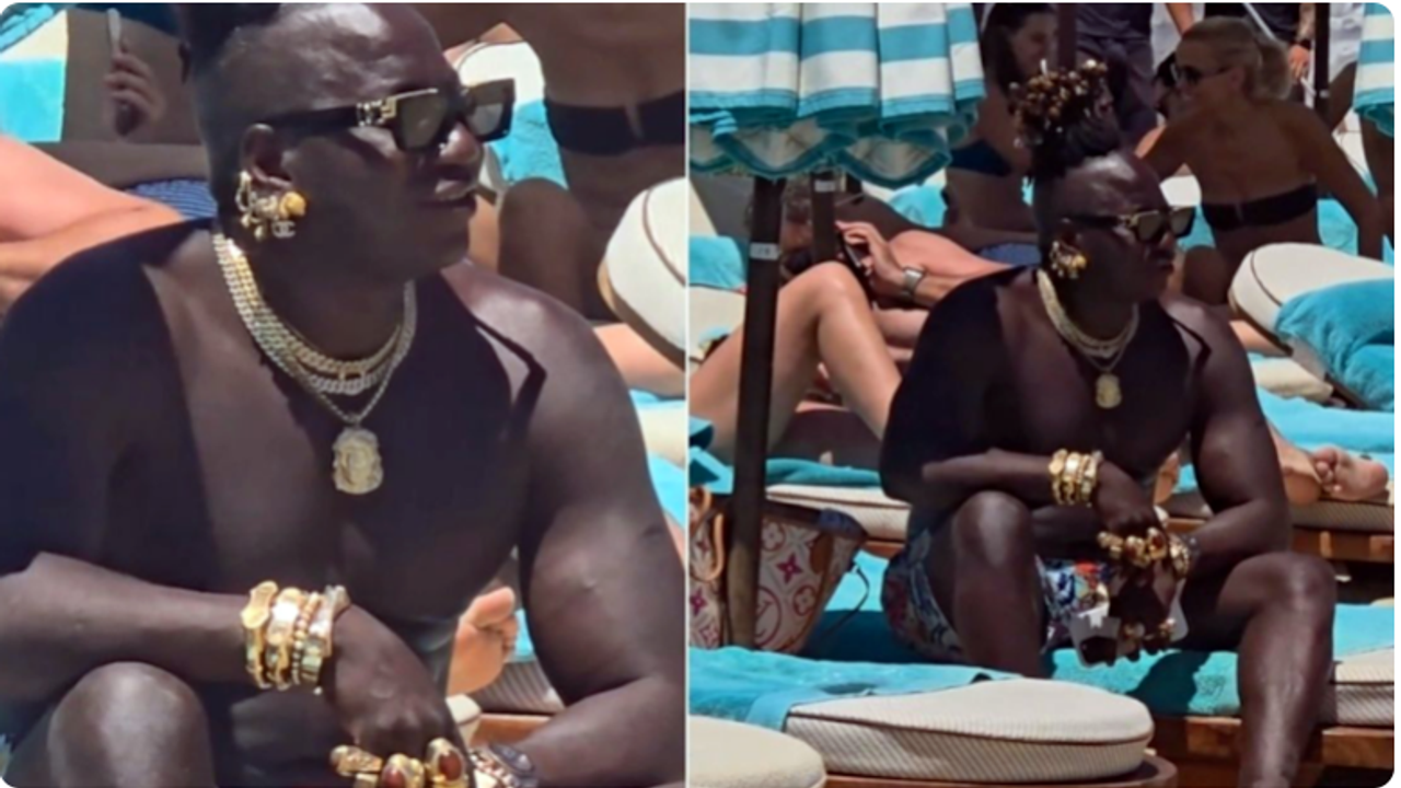 Dünyaca ünlü turistik Mikonos adasının Nammos plajlarına boynunda ve kollarında 1,5 kilograma yakın altın , pırlanta ve değerli takılarla gelen iri yarı siyahi bir turist ilgi odağı oldu.