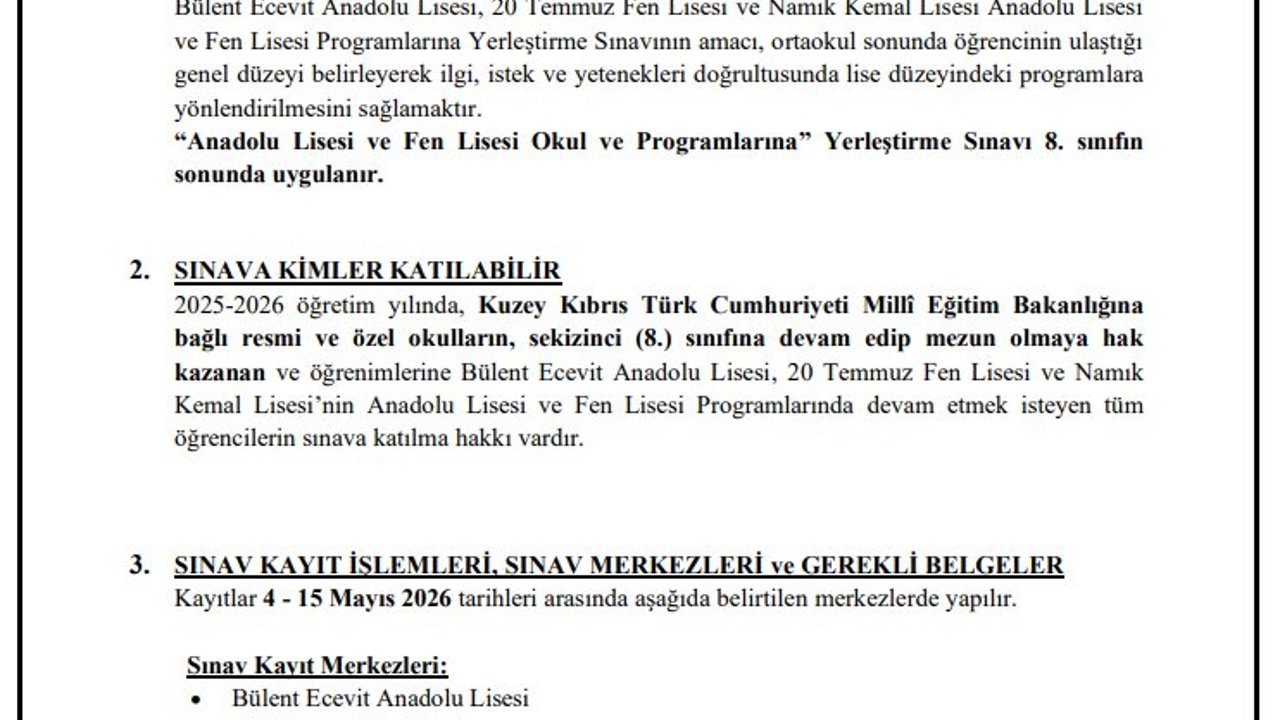 Bize ulaşan bazı eğitimci kişiler KKTC Milli Eğitim Bakanlığı web sitesinden yapılan paylaşıma göre 2026-2027 eğitim yılı ile birlikte Gazimağusa’nın güzide liselerinden olan Namık Kemal Lisesi’nde eğitimin iki ayrı programla verilmeye başlanacağının açıklandığını kaydettiler.