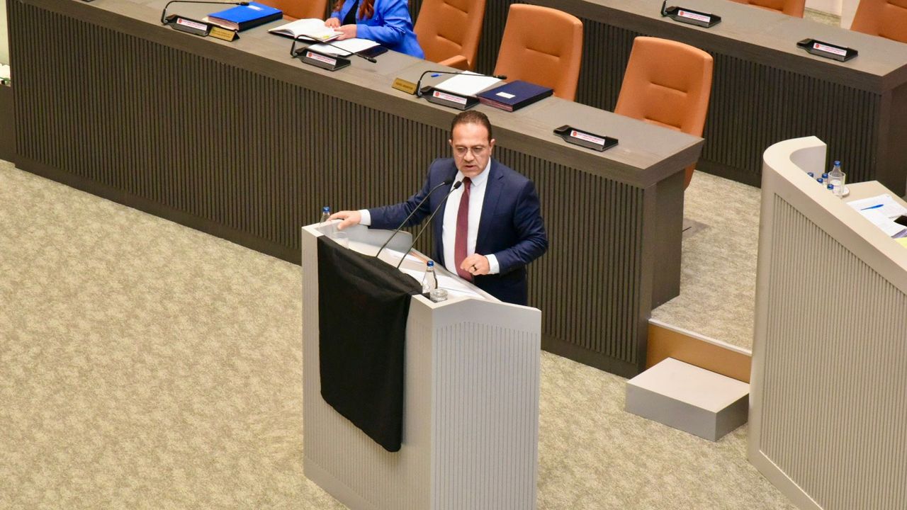 Cumhuriyetçi Türk Partisi (CTP) Milletvekili Erkut Şahali'nin, konuşmasına kürsüye siyah bayrak asarak başladı ve bunun iç tüzüğe aykırı olduğunun farkında olduğunu belirterek, “Gereği her neyse yapınız” dedi.