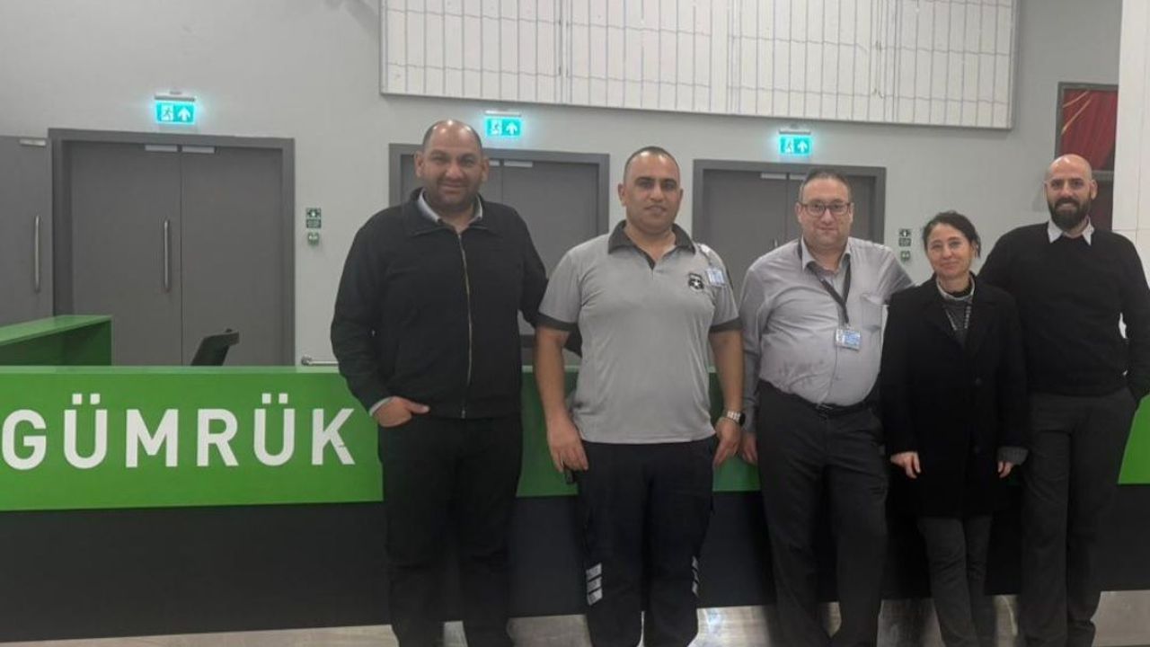 Havalimanı’nda görev yapan gümrük memurları Ahmet Ersöz, Derya Sadıkoğlu, Kadir Açıkgöz, Halil Dümenci ve Hasan Yalçınkayalı nöbetlerinin bitmesi sonrasında birlikte nöbet sonu fotoğrafı çektirdiler.